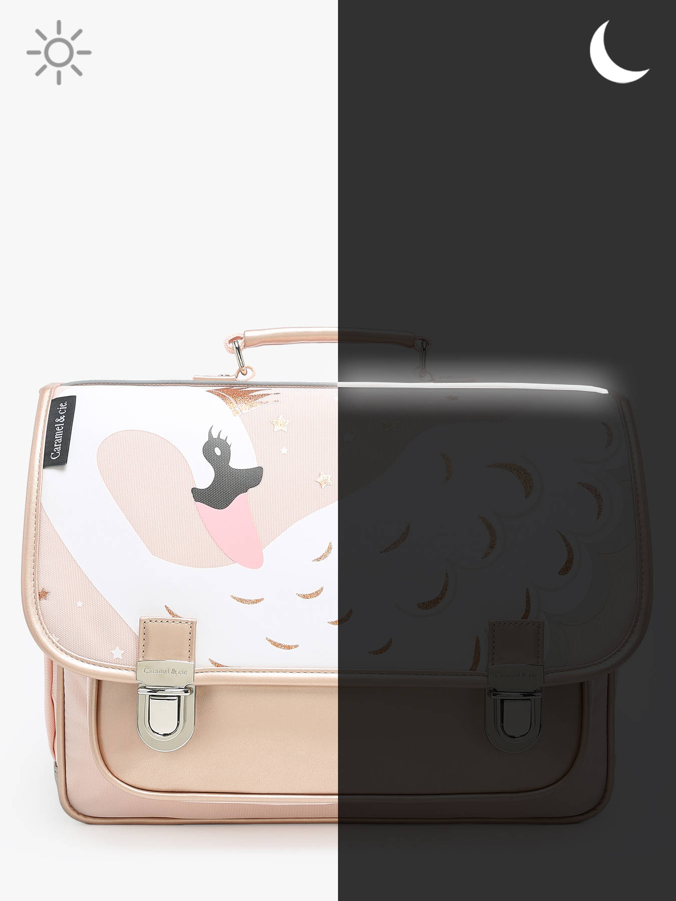 Boekentas 2 compartimenten van de lijn Boheme van Caramel et cie, om ofwel in de hand ofwel op de rug te dragen. Ideaal om A4-formaten en andere mee te nemen.