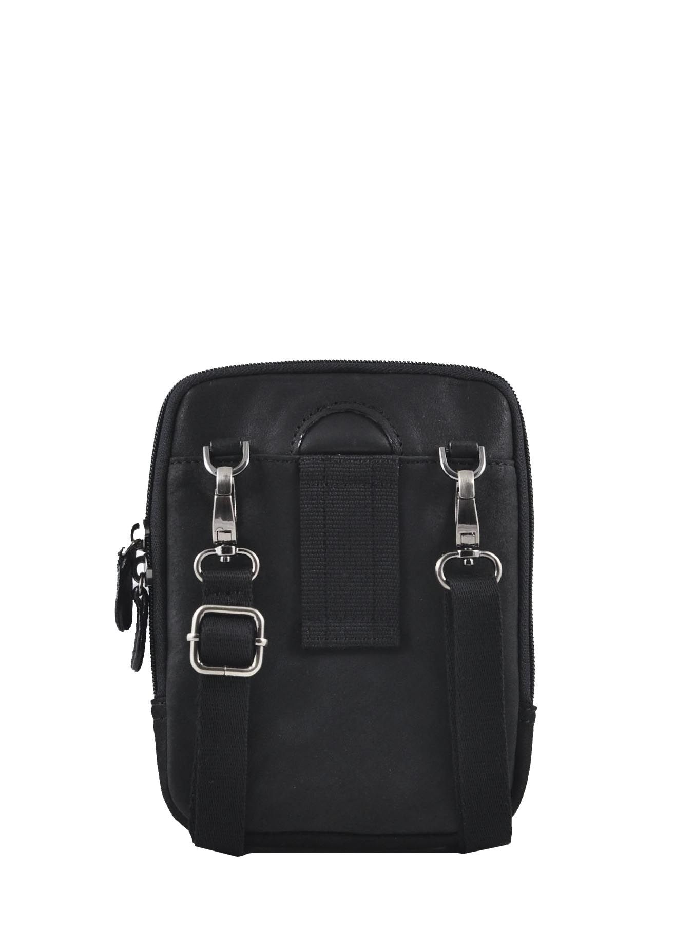 Compact lederen cross body tasje met afneembare riem. Hij kan ook op de broeksriem gedragen worden. Vooraan voorzien van een extra opbergvak met rits. Ruim genoeg voor het opbergen van de essentiële spulletjes. Voorzien van gleufje om draad van MP3 speler met oortjes door te steken.